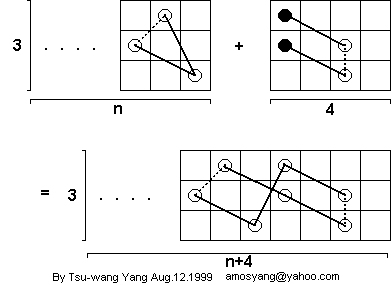 Now comes the inductive step. Assume a 3 x n closed tour exists. Then a 3 x (n + 4) closed tour also exists, and can be constructed as shown above. 3 x 10 and 3 x 12 closed tours exist (and are shown above). Therefore a 3 x n closed tour exists if n >= 10, even. Such a tour can be constructed by gluing the above 3 x 4 open tour to a closed 3 x 10 or 3 x 12 closed tour a certain number of times: