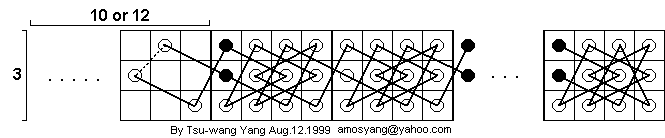 In the diagram above, it is assumed that the left end square of the 3 x n open tour is not in the right column. It could be anywhere else, though. Thus the 3 x 7, 3 x 8, 3 x 9, and 3 x 10 open tours shown above meet this criterion. By induction, there exists a 3 x n open tour, n >= 7, with an end square in the corner.