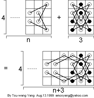 If an m x n board has an open tour that ends on a corner square, this 4 x n open tour can be added to the m x n open tour, and the result will be a 3 x (n + 4) open tour that ends on a corner square. Here's what the new tour looks like: