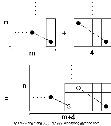 In the diagram above, it is assumed that the two end squares of the 4 x n open tour are not in the right three columns. Thus the 4 x 6, 4 x 7, and 4 x 8 open tours shown above meet this criterion. By induction, there exists a 4 x n open tour, n >= 6, with the two end squares near the lower left, as in the examples above.