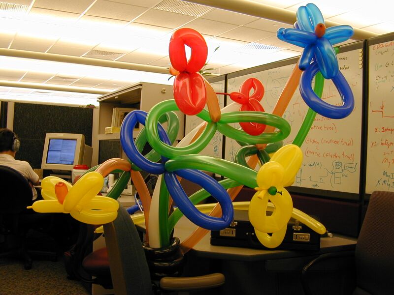 Some of the guys in the office got together and sculpted a bouquet of flowers for Mike, using balloon sculpture material supplied by Dave Haverkamp. The bouquet was delivered Wednesday, June 13, and brought delight to Mike and mirth to the hospital staff.